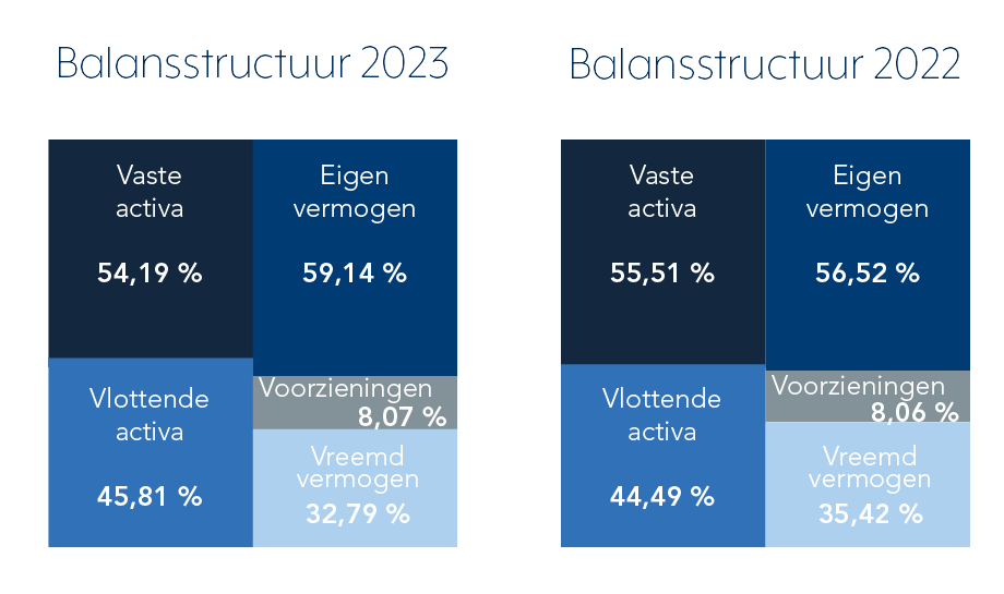 Het eigen vermogen is gestegen van 56,52 % van het balanstotaal in 2022 naar 59,14 % in 2023 o.a. door de toevoegingen aan de bestemde fondsen en het positieve resultaat van 2023. Door de aflossing van kredieten is het aandeel van het vreemd vermogen gedaald van 35,42 % naar 32,79%.